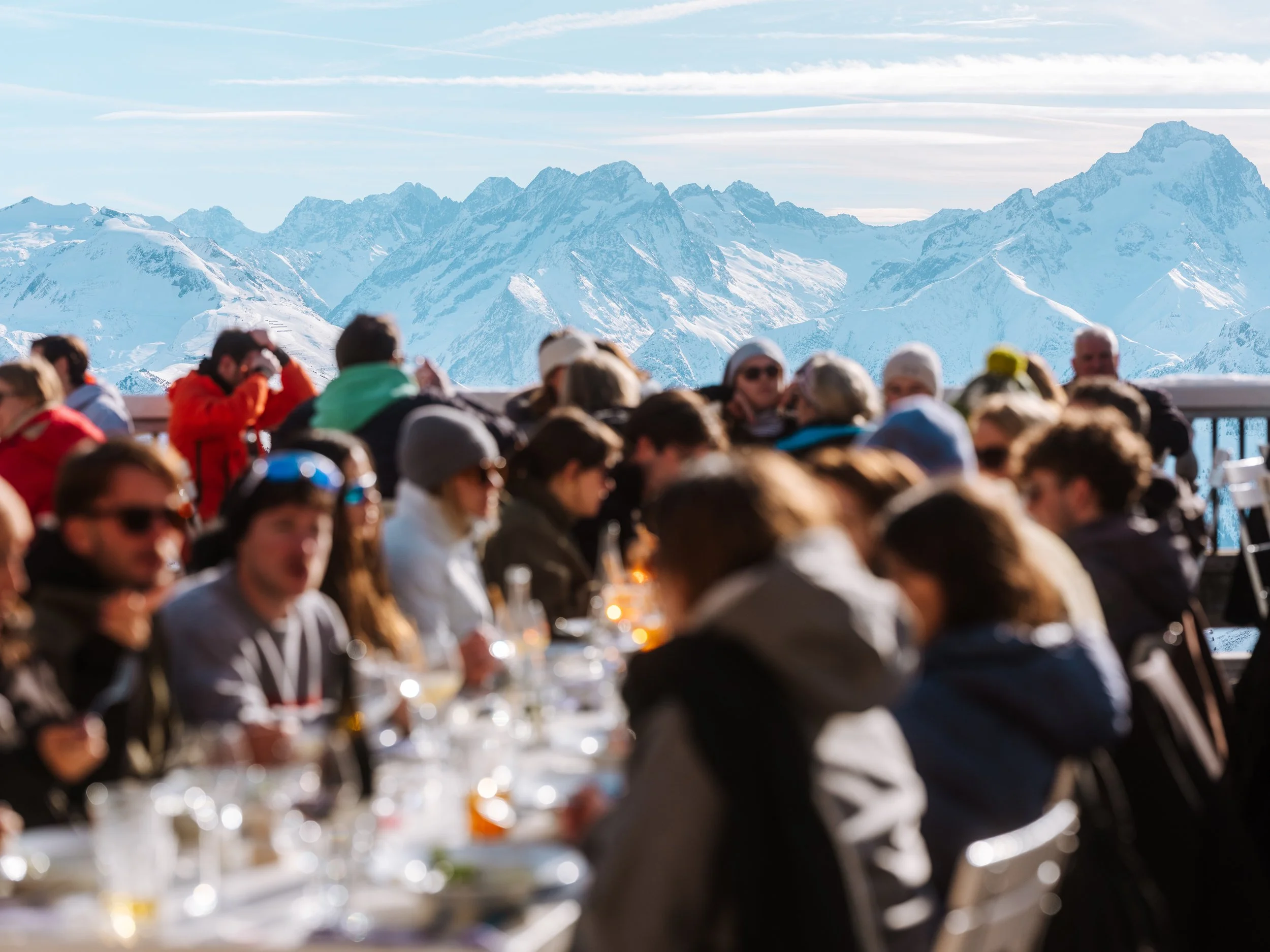 Dernier déjeuner festif à La Fruitière, institution locale du groupe La Folie Douce. Grande terrasse ensoleillée, vue montagnes, on chante, on danse, on célèbre jusqu'à la dernière minute.